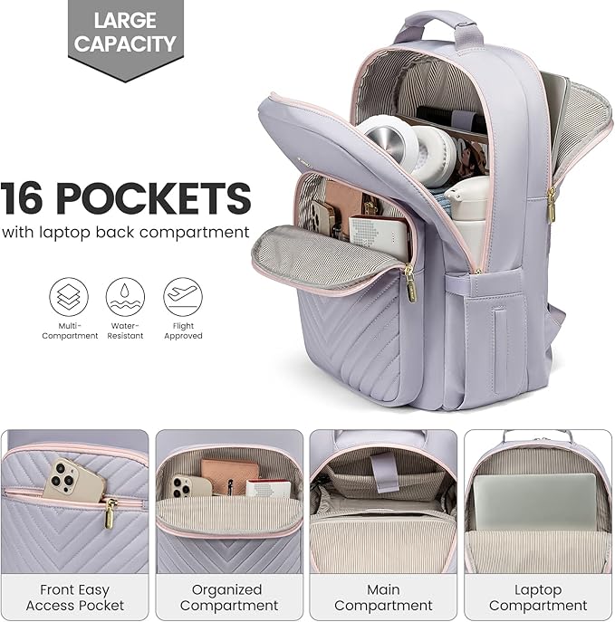 - 💯【Upgraded Laptop Backpack Women】: Classic V-shaped embroidery thread. Upgraded double LOVEVOOK no-slip metal zippers,water resistant Nylon fabric with polyester lining, ensures long lasting usage. Total of 4 compartments and 16 pockets for your computer,A4 folder,bottles,umbrellas,clothes,work supplies,college supplies and travel essentials.Dimensions: 13"L 20"H 9"D, Weight: 1.9lbs.