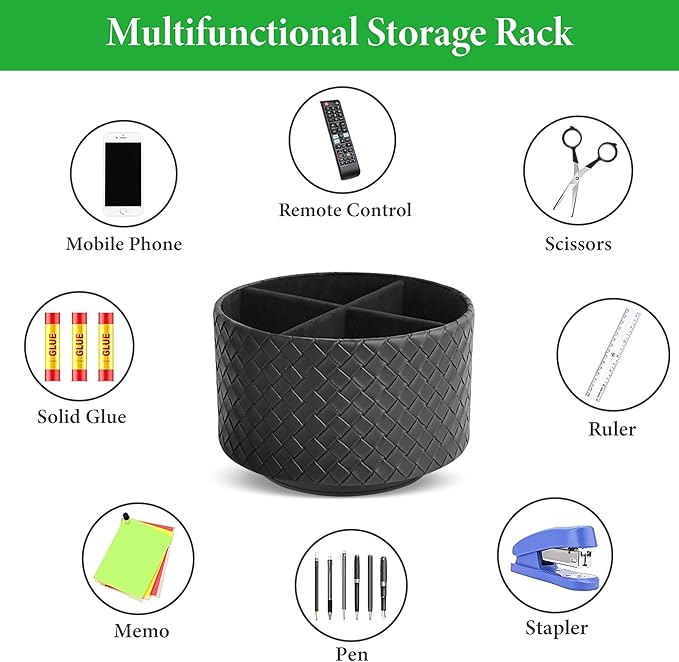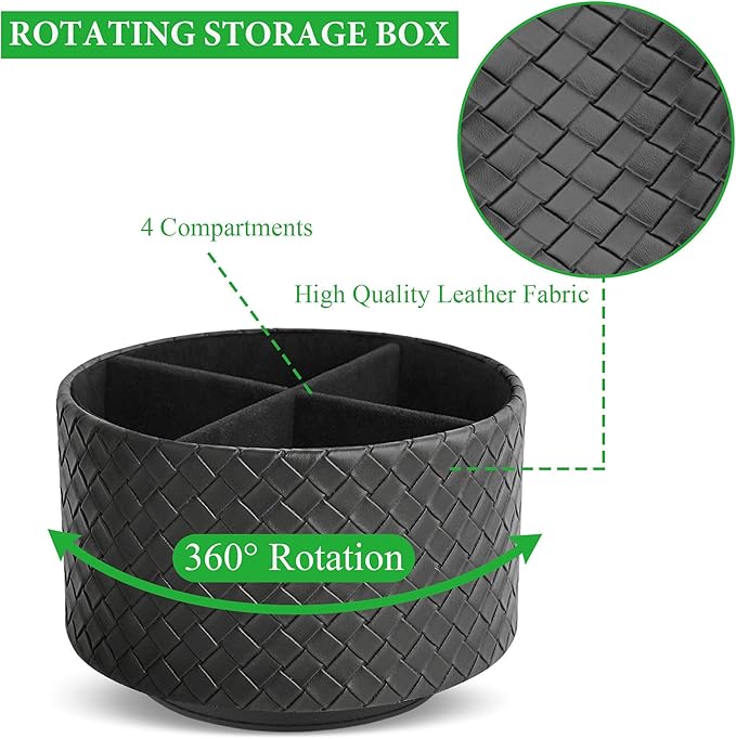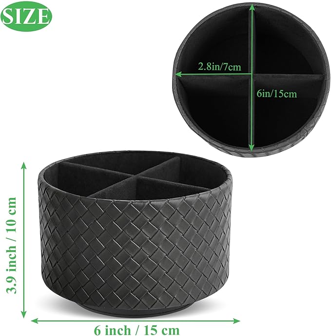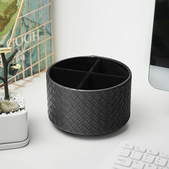 Hennaja Round Leather Art Supply Organizer,Remote Control Holder,360 Degree Spinning,Multi-Functional Pencil Holder,4 Compartments Desktop Stationary Organizer(1-Weave Black)