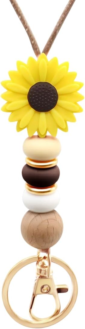 Flower Teacher Lanyards ID Badge and Key Chain, Cute Silicone Beads Lanyard for Women Nurse Work Student (Sunflower)