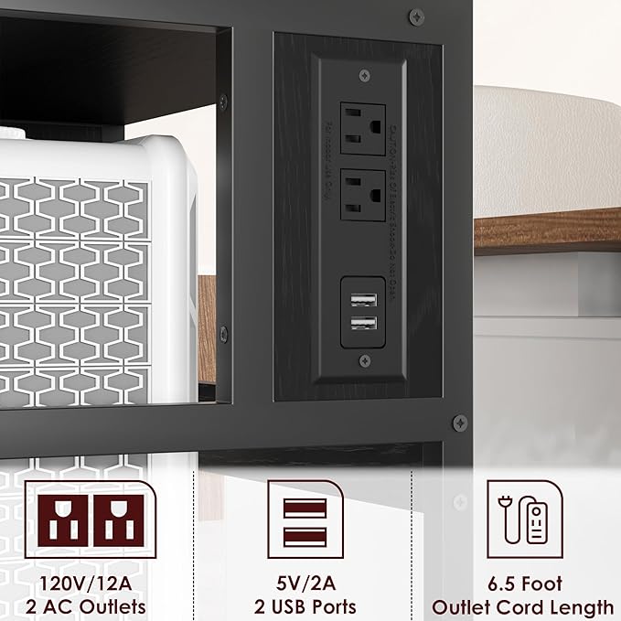 - PRINTER STAND WITH CHARGING STATION: The power strip of the rolling printer stand has 2 AC outlets and 2 USB ports to allow you to plug in multiple appliances, meeting your demand to utilize devices simultaneously. The built-in power board has overload protection and leakage protection functions, all for safety reasons.