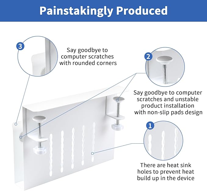 - Multifunctional Desk Side Storage & Anti -Slip And Anti -Scratch Design: This laptop holder can be retrofitted to the side of a desk to easily hold a laptop, tablet, hidden wires, interior accessories, manuals, documents, notebooks, and other items. On the inner surface of our desk side storage rack, the bottom and ends of the clamp have a non-slip sheet, which can help secure laptop in desk side hanging storage to avoid scratching desktop laptops, tablets or other devices