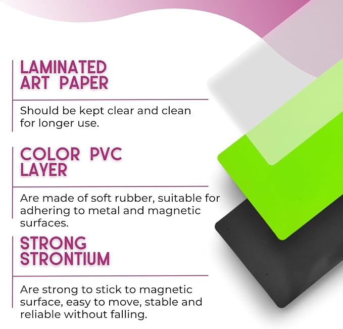 - High-quality Material: The magnetic dry-erase labels have a white writable front with a colored edge, made of laminated art paper, dry-erasable, and a 0.04 inches thickness strontium magnet, on the back for a powerful adhesion to various surfaces; Each label measures 3.2 x 1.2 inches;