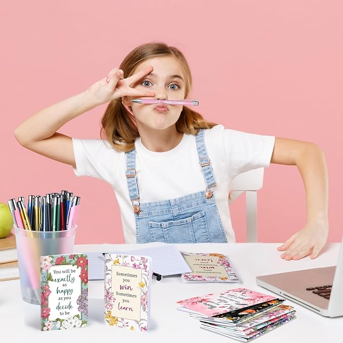 - Motivational Gift Set: the package comes with 32 pieces of inspirational gifts, including 16 pieces of inspirational pens in 8 classic colors and 16 pieces of inspirational mini notebooks in 8 different floral styles, enough amount can meet your various needs
