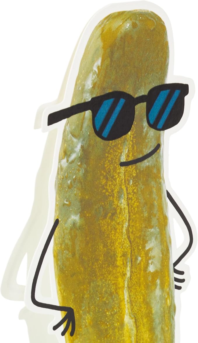 - Funny pop-up greeting card features three-dimensional cartoon artwork of a personified pickle wearing sunglasses paired with a compliment and a pun sure to make them smile. Die-cut design.