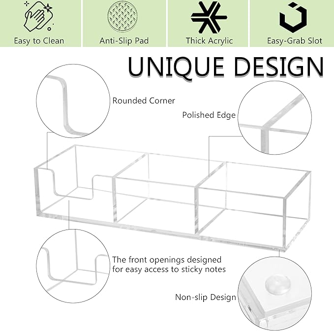- Premium Acrylic Material: Stick note holder is made of premium crystal clear acrylic with high purity and clarity, which is stable, long-lasting and environmentally friendly. PLEASE DO NOT USE ANY ALCOHOLIC CLEANER TO WASH, to prevent damage to products. Use soft cloth to wipe instead