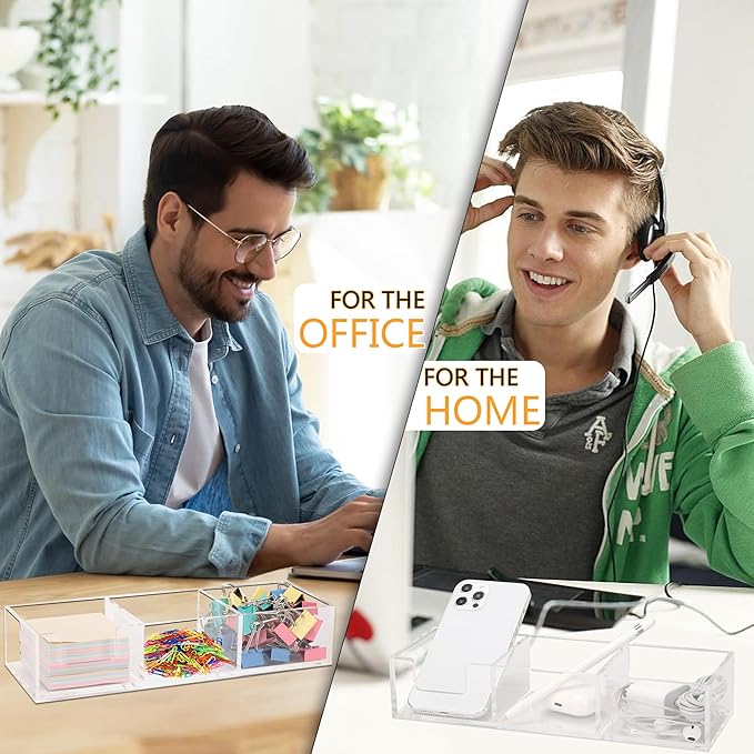 Acrylic 3in1 Sticky Note Holder Desk Organizer, 11.8" x 3.9" x 2.3" Self-Stick Memo Pad Dispenser for School Office Home Post Bank with 3 Compartments (DP003)