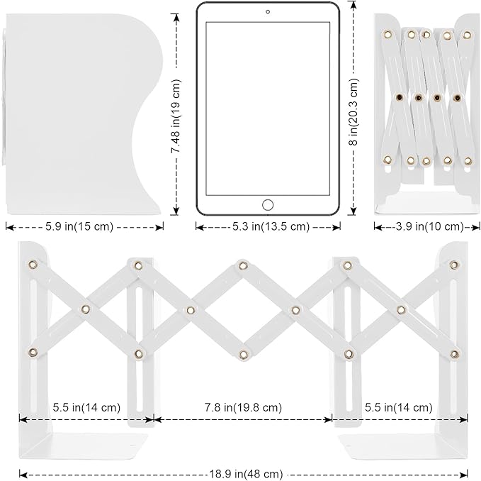 - Size: 3.9-18.9 inch x 5.9 inch x 7.5 inch, the adjustable bookend can be expand to 18.9 inch and contract to 3.9 inch to meet various needs, you can easily remove one item without dislocating the others.
