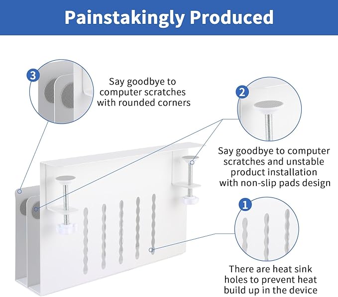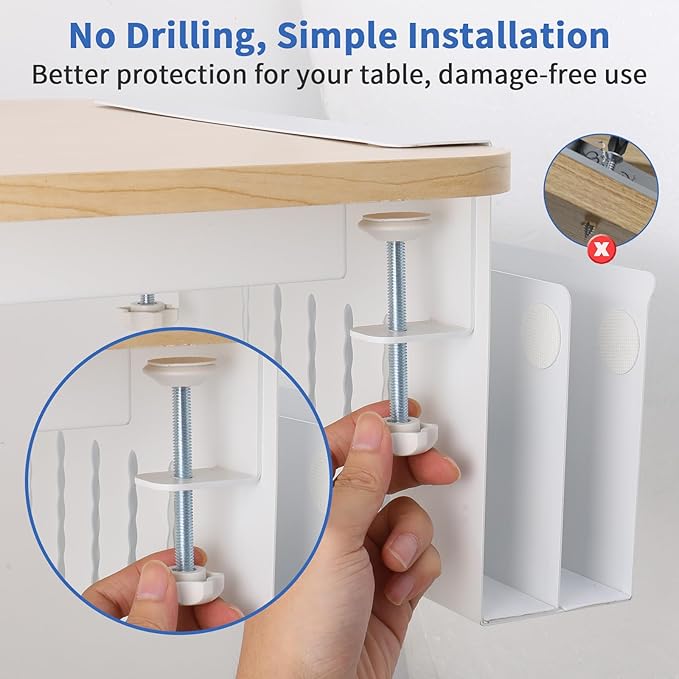 - No Drilling & Easy To Install: Our no drill desk side storage, laptop holder under desk is easy to install. And the silicone cushion can prevents scratches on desks and other objects, the rounded corners design can also avoid scratches. No extra tools are needed and importantly it won't damage your desk. (Note: Before purchasing, please confirm whether the upper and lower edges of the sides of your desk are flat and whether the size is suitable for your desk. You can refer to our pictures to confirm whether our side of desk storage is suitable for your desk.)