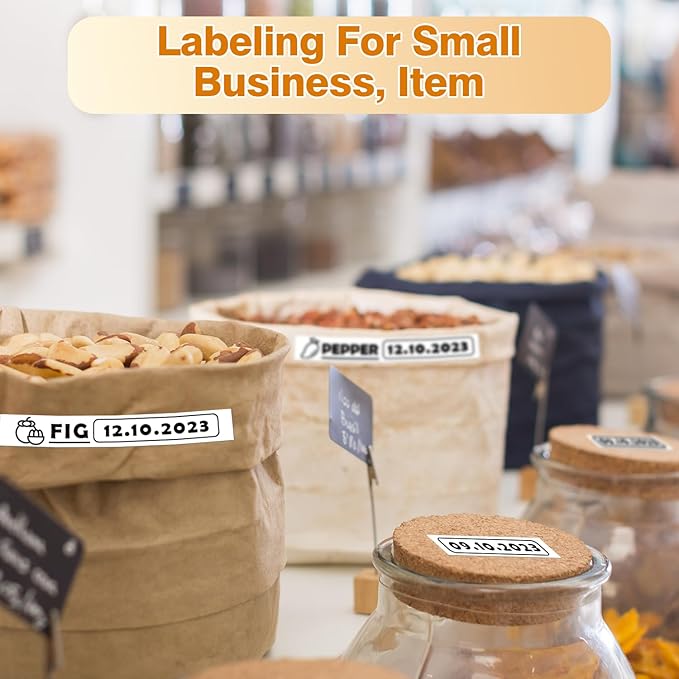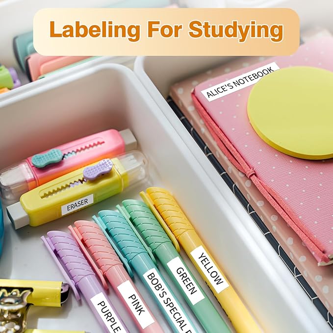 - [ Widely use ] The satisfactory-quality label maker tapes that adhere to plastic, paper, metal, wood, and glass and is ideal for labeling office supplies, electronic accessories, tools, kitchen items, garage equipment, containers, supply cabinets, storage boxes, personal items, crafts, gifts, files and more for identify items and quickly organize