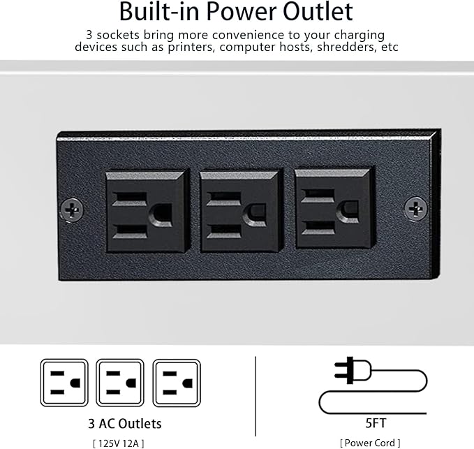 - 【Built-in Power Outlets】The printer table for home office is configured with charging station on the back panel. There are 3 AC outlets, that allows for simultaneous charging of the printer, computer host or shredder, and your laptop. We provide 5ft length power cord for your flexible use of position.