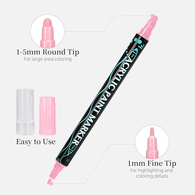 - Versatile Dual-Tip Design: Discover the ultimate in versatility with our acrylic paint marker featuring dual tips. Effortlessly switch between a broad round tip (1-5 mm) for covering large areas and a fine tip (1 mm) for detailed outlining, offering limitless creative options.