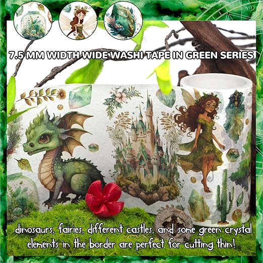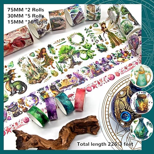 - 【ORIGINAL DESIGN, MAGICAL THEME】 - Our magical washi tape set is an original design with fantastical magical elements. Fairies, dragons, gems, magic potion bottles, castles, cats, books, mirrors, butterflies and stars, moon, winter elements like snowflake. Come and immerse yourself in the fantastic world with this set of washy tape