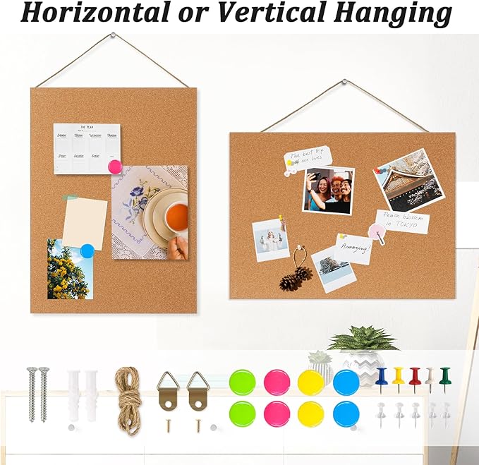 - Easy Mounting Corkboard: a set of mounting accessories included. We'll pre-drill the holes on the frame of the small bulletin board. You can hang the cork board for wall by yourself, horizontally or vertically. Moreover, you can combine two cork boards as you like.
