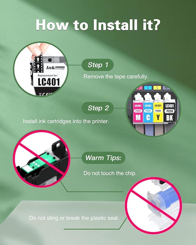 - WARM TIPS: Please reconfirm your printer model before placing order. Make sure your printer will use for Brother LC401 ink cartridges.