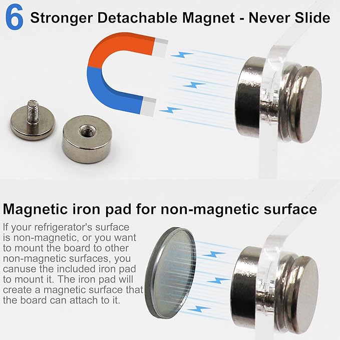 - [Anti-sliding & Anti-scratch & Sturdy Design] Magnetic dry erase board calendar uses 6 extra strong detachable magnets, which can be firmly attached to the refrigerator or various metal surfaces with wery strong grip. Magnet calendar for fridge won't fall off or move easily unless manually. The clear fridge dry erase board also suitable for slightly curved refrigerator door. After removing the magnets, you can hang it anywhere.