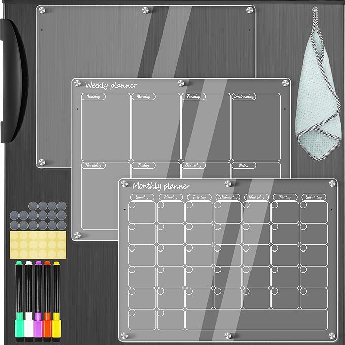 - [Easy to Write, Easy to Read, Easy to Erase] 3 Pcs Stylish magnetic clear dry erase calendar for fridge set allows you to write more for messages and memos. Refrigerator calendar magnetic dry erase is made of 0.12 inches clear thick acrylic, not easy to scratch and break. The surface is easy to clean and erase, you just use our cloth with water for complete cleaning. Your acrylic white board without leaving any stains or ghosting.