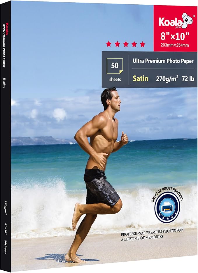 Koala Ultra Premium Photo Paper 8 x 10 In Satin Photo Printer Paper for Inkjet Printer Water-Resistant Semi Gloss 50 Sheets 72lb