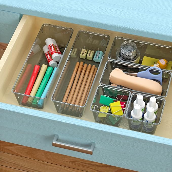 - 3 Combinations of Different Sizes: Our set drawer organizer includes 6pcs storage bins in 3 different sizes. Include:9 x 3 x 1.8 inches (4 pcs), 6 x 3 x 1.8 inches (4 pcs), 3 x 3 x 1.8 inches (4 pcs)