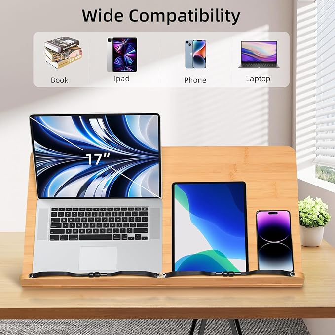 wishacc 24" Oversized Large Bamboo Book Stand & Holder for Reading Hands Free for Large Books in Bed,Cookbook,Textbook,Law,with 8 Adjustable Height Laptop Stand