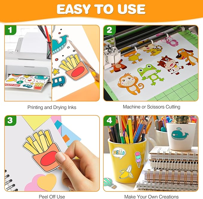 - Easy to Use: Compatible with most laser and inkjet printers, such as Brother, Canon, Epson, HP, etc. We just put it directly into the printer. In addition, it fit for processing knives and easy to engrave different sticker patterns.Unique backing layer makes peeling a breeze, while premium glue makes application easy and smooth.