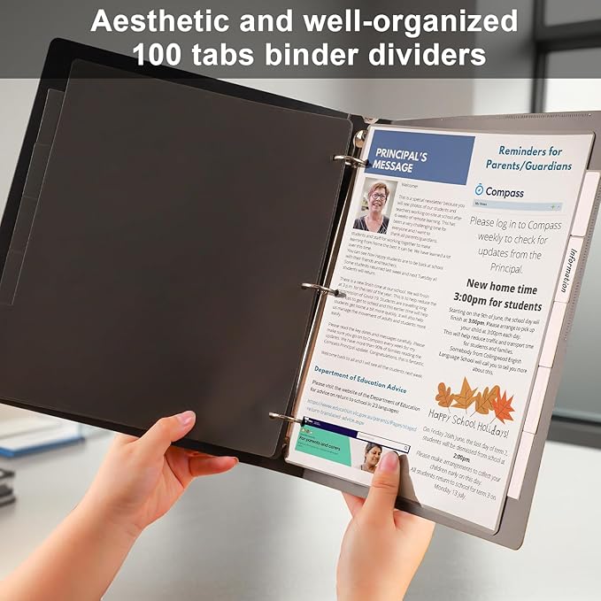 - Easy Organizing with Binder Dividers with Tabs: Made from sturdy plastic, these black binder dividers with tabs are perfect for sorting out your files. Each package contains 100 dividers for 3 ring binder, effectively organizing your desktop files.