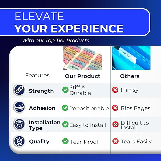 - Includes Alignment Card for Perfectly Aligned Tabs: Our tabs are easy to install in a perfect alignment using our tabs alignment system. Each tab includes the location and page number for super easy installation.