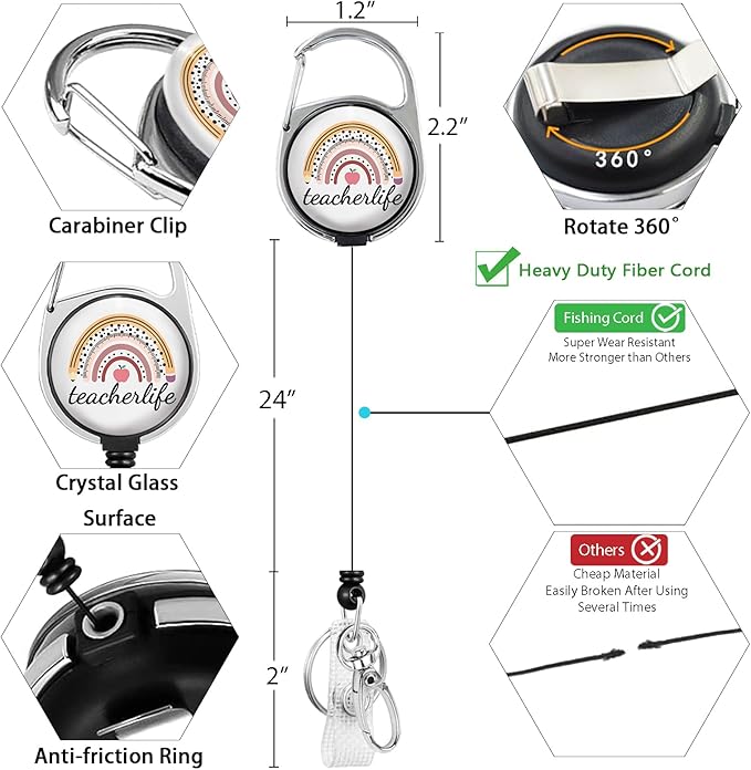 - Versatile Usage: The retractable badge reel is made of premium plastic and steel, sturdy and light-weight. It is easy to clip on to a belt, backpack, pocket or anywhere you like, with 360 rotating carabiner clip. You can attach your keys, student cards, or ID cards to the key holder easily and conveniently. Great for nurses, doctors, maintenance, office staff, business people, teachers, students, factory workers, drivers, etc