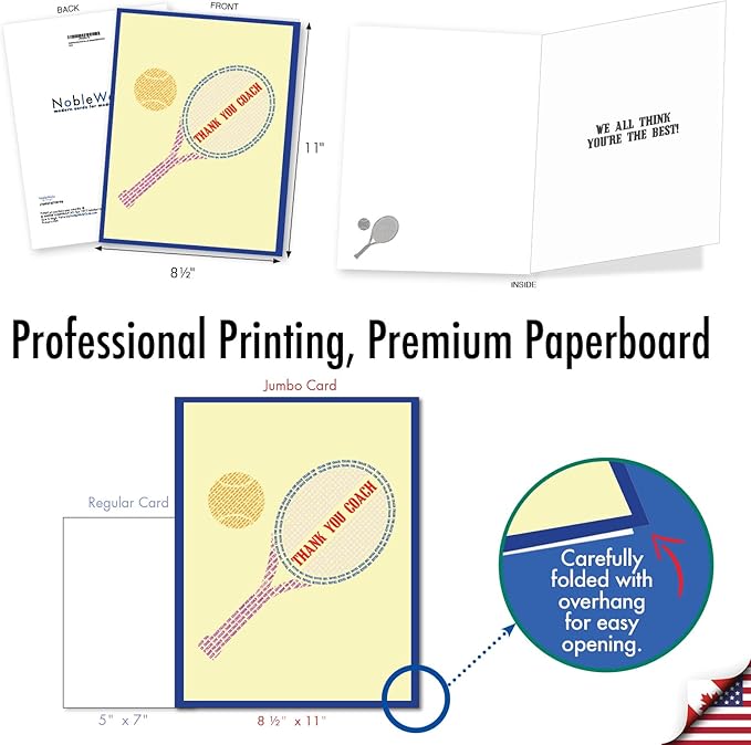 NobleWorks - Jumbo Team Coach Thank You Greeting Card From Us 8.5 x 11 Inch with Envelope (1 Pack) Sports Teacher Gratitude, School Athlete Appreciation Notecard, Tennis Racquet J10037ATYG-US