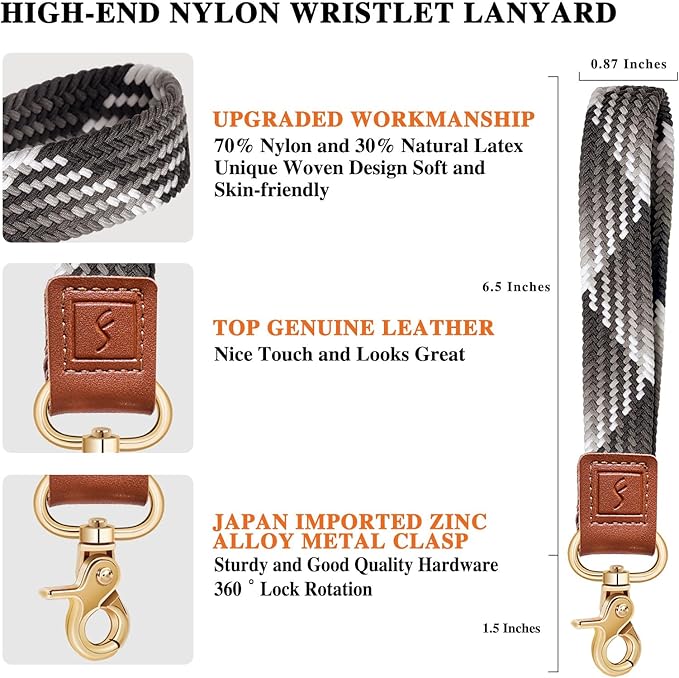 - Upgraded Stretchy Design: Fishent wrist lanyard is roughly 0.87 inches width and 6.5 inches length from the bottom of the leather to the top of the wrist key loop, with super-soft weave strap(stretchy), genuine leather and quality metal wristband keyring clasp lanyards for keys. The hand wrist lanyards keychain adopt unique upgraded stretchy nylon design, the wrist strap is soft and textured. Comfortable to wear and not easily deformed.