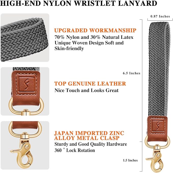 - Upgraded Stretchy Design: Fishent wrist lanyard is roughly 0.87 inches width and 6.5 inches length from the bottom of the leather to the top of the wrist key loop, with super-soft weave strap(stretchy), genuine leather and quality metal wristband keyring clasp lanyards for keys. The hand wrist lanyards keychain adopt unique upgraded stretchy nylon design, the wrist strap is soft and textured. Comfortable to wear and not easily deformed.