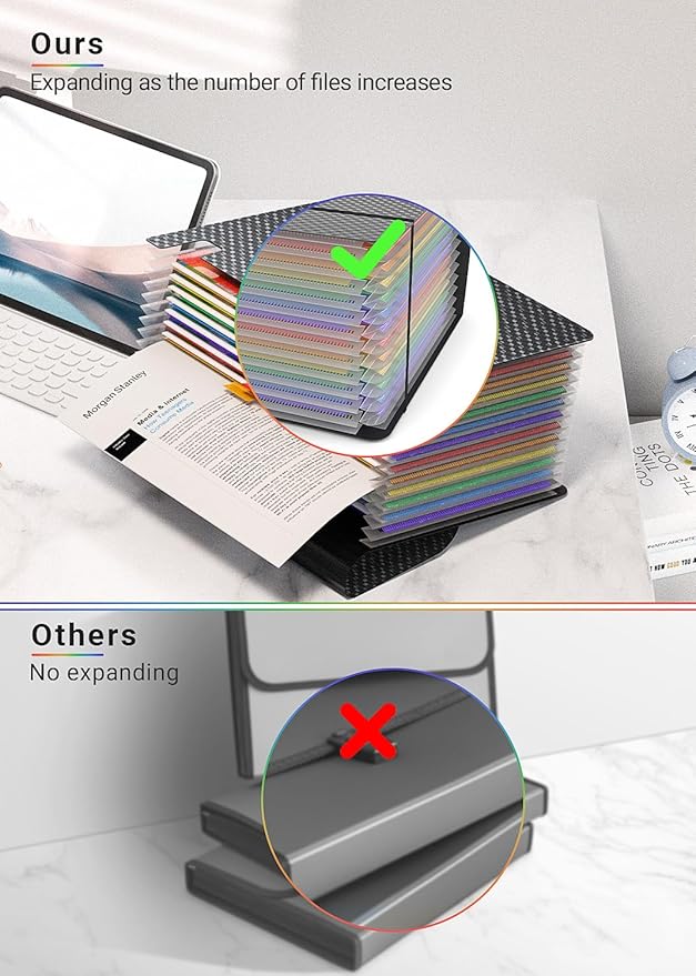 - ✔【TOP-GRADE MATERIALS【TOP-GRADE MATERIALS】 Expandable file folder are made by high quality polypropylene and polyester, 20% and more thicker than other file folders, it can stand on the desktop independently, no easy to be broken and deformed. 100% Waterproof, Non toxic, Non Odor, Anti-wear, tear and Moisture resistant.