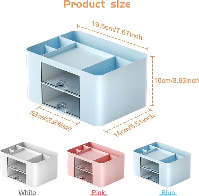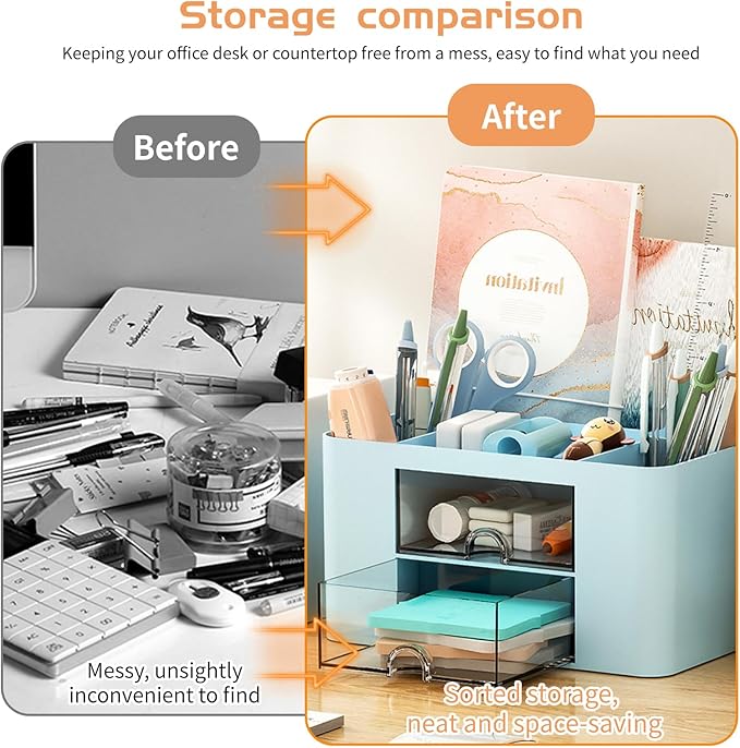 - 【Versatile Design】This Desktop Storage Box has 2 drawers and 5 large capacity divided compartments, no assembly required. It has enough storage space to accommodate all of your school supplies. Keep things at hand while not disturbing, improving work efficiency