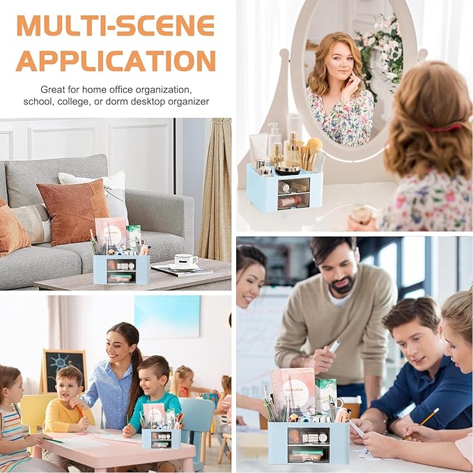 Pencil Pen Holder for Desk,2 Drawer Desk Organizers,5 Compartments Desktop Storage Stationery Supplies Organizer, Cute Pencil Cup Pot For Office, School, Home(Blue)