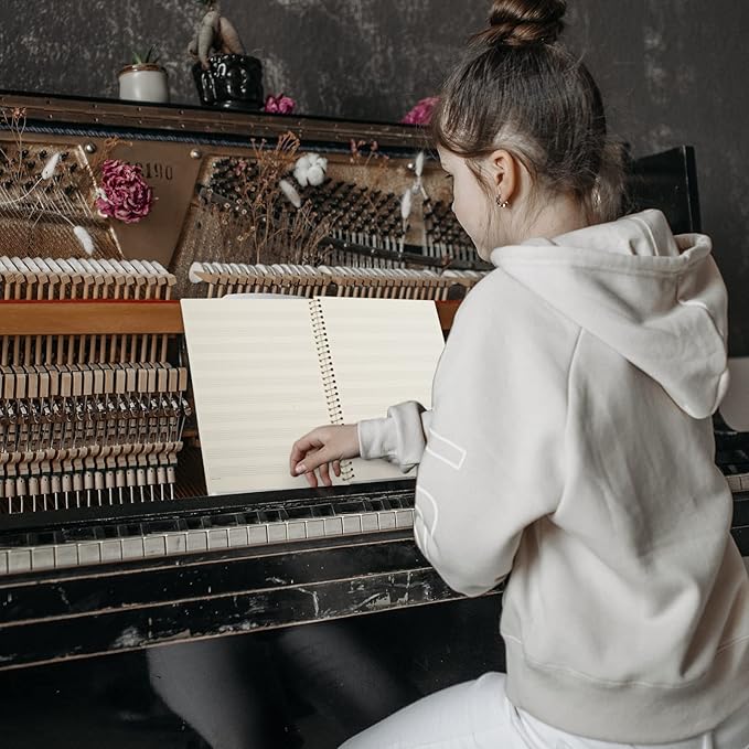 - Coil binding music notebook is more convenient to use; Double-sided writing without ink bleeding; Beige blank sheet for eye protection;