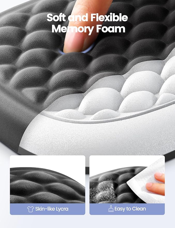 - 【Softer and More Comfortable】The materials of wrist rest are improved into higher quality memory foam and covered with a silky smooth lycra. The soft texture of memory foam can evenly distribute the pressure around your wrists and provide good support with just enough give. The computer wrist rest makes you as comfortable and cushiony as like rest your elbow on clouds.