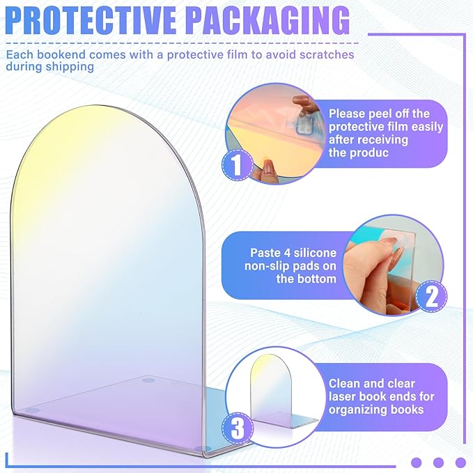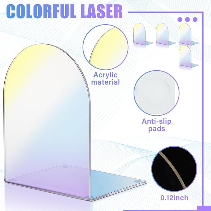 - Delicate Design: the acrylic book ends are designed with rounded edges formed by the arch shape, which will ensure that your bookshelf or books will not be scratched, the slim and L shaped design of the non slip arch bookend won't take up space on your bookshelf or on your books, matched with holographic clear surface, look classic and simple