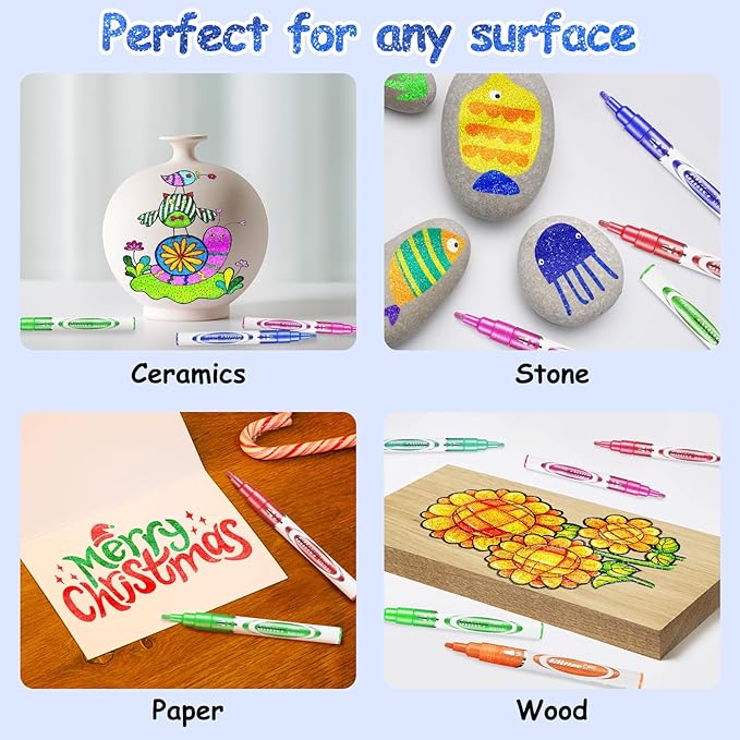 - 【Why Choose This Glitter Pen】 Glitter acrylic paint markers has a Sparkle and attractive writing effect, suitable for casual creation and play, and can also be embellished and modified on professional paintings; Moreover, these glitter pens are so fun to apply to a variety of painting interfaces, such as books, greeting cards, Birthday Cards, scrapbook journals, photo albums, glass, wood, stone, art supplies, etc.