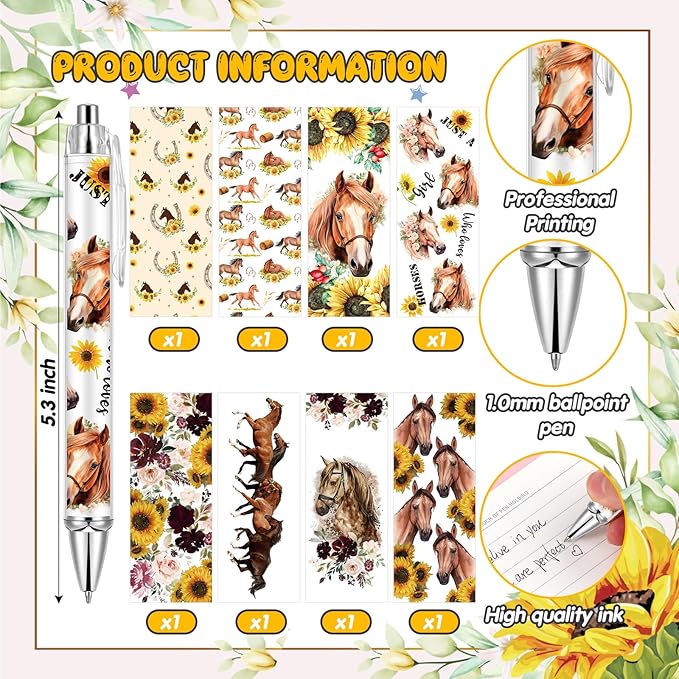 Ireer 8 Pcs Ballpoint Pens for Women 1.00 mm Cute Black Ink Fancy Pens Fine Point Smooth Writing for Journaling Aesthetic Office Supplies(Horse)