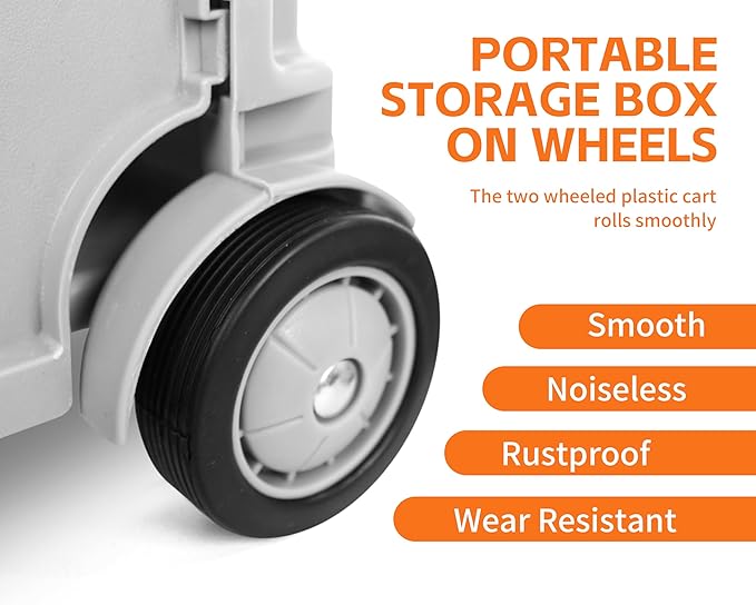 - PORTABLE STORAGE BOX ON WHEELS – This Handcart total weighs 6 pounds but can hold up to 80 pounds! The two wheeled plastic cart rolls smoothly for efficient