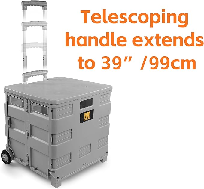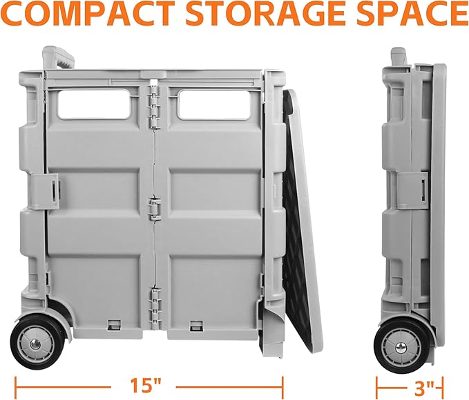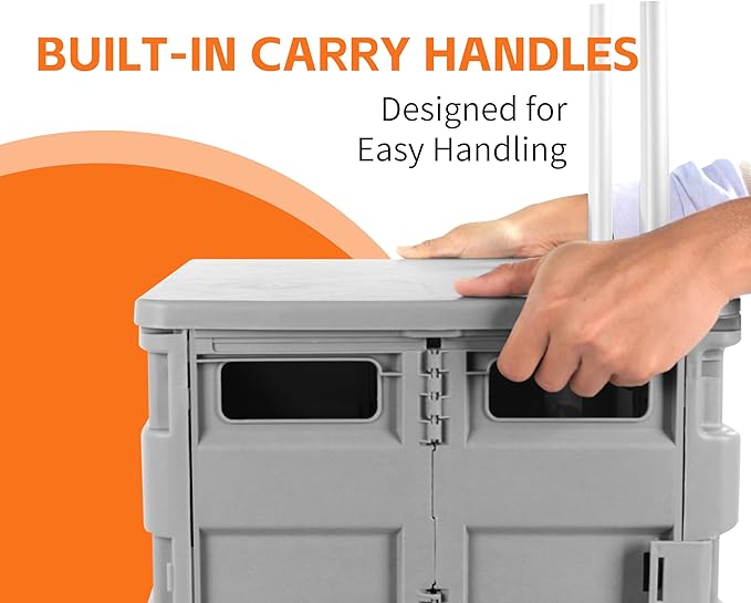 - STORAGE CRATE WITH WHEELS AND HANDLE – Designed to make life easier, this roller cart is the perfect storage dolly for carrying items to and from job sites, the grocery store, college classes, and makes a great office folding cart.
