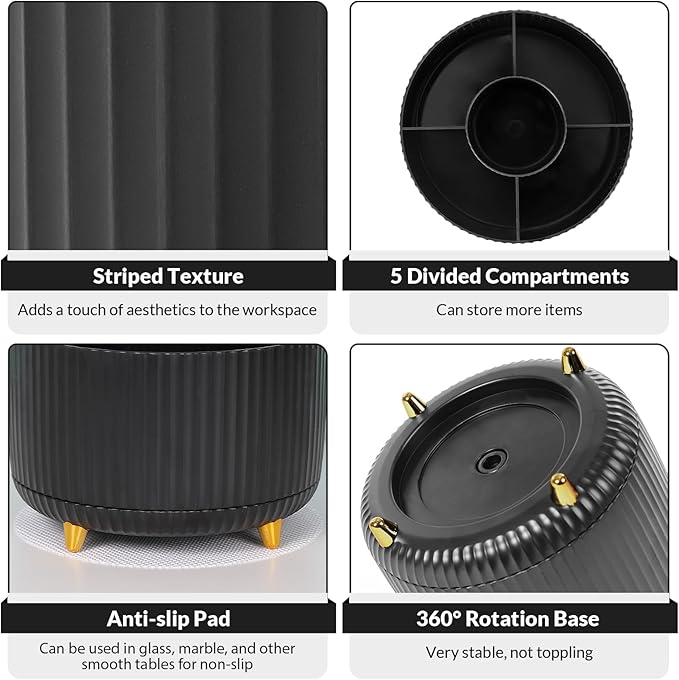 - Space-Saving: The design of 5 compartments provides enough storage capacity without taking up a lot of desktop space. This 5*3.8 inch desk organizer can be placed anywhere in the office, vanity, bathroom, bedroom, and living room