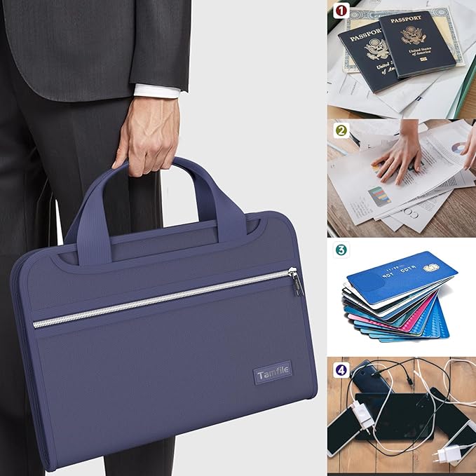 Tamfile Fireproof Accordion File Organizer with Handle, 13 Pocket Expanding File Folder with Zipper & Labels, File Folder with Multi-Pockets Paper Organizer Folder for Letter A4 Files, Blue