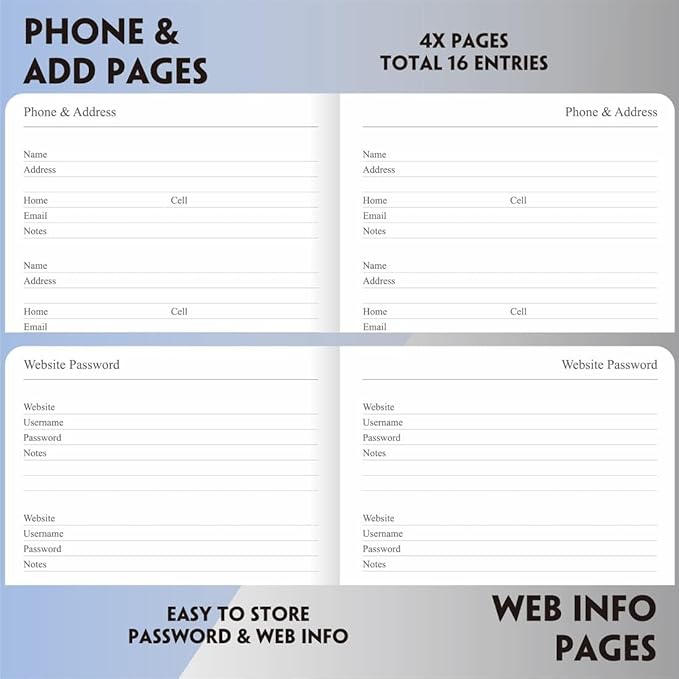 - Major holidays listed, important date pages, 4 password, address and expense pages, and notes pages