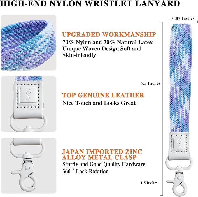 - Upgraded Stretchy Design: Fishent wrist lanyard is roughly 0.87 inches width and 6.5 inches length from the bottom of the leather to the top of the wrist key loop, with super-soft weave strap(stretchy), genuine leather and quality metal wristband keyring clasp lanyards for keys. The hand wrist lanyards keychain adopt unique upgraded stretchy nylon design, the wrist strap is soft and textured. Comfortable to wear and not easily deformed