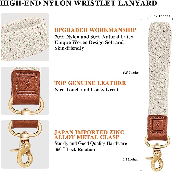 - Excellent Materials: Our wristlet key lanyard is light and strong, not easy to break or fade, and can provide you with a long-lasting user experience.This wristlet keychain for women is made with braided nylon and genuine leather is skin-friendly, has a quality zinc alloy metal wristlet strap key loop make it more solid and sturdy, can maintain long-term use to keep your wrist lanyard for keys, ID badge, or other essentials secure,suitable for long time wear.