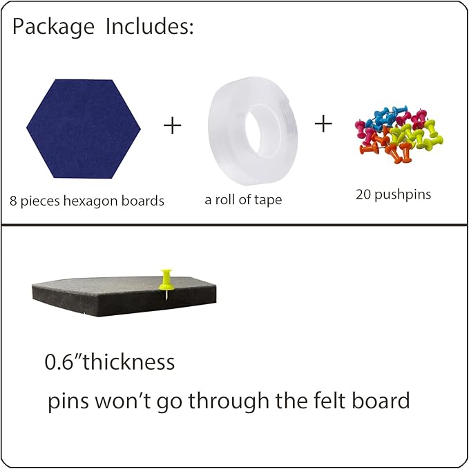 - 1. Size and Material - The size of the bulletin board is 7.0 × 6.1 inches. Each hexagon board is 0.6 inches thick, The pin won’t poke through the board. The surface of the felt board is covered with felt and the back is made of EVA, sturdy and lightweight.