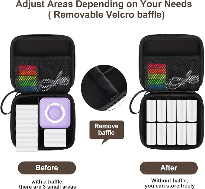 - 【Removable Velcro Partition baffle】This sticker printer storage case inside is designed with a baffle with 3 partitions, which can be removable and attachable with Velcro design. You can remove the baffle to fit a more large size printer or label maker, even a camera. More flexible to fit your needs. After attaching it, the case inside will be separated as 3 parts to organize your items.