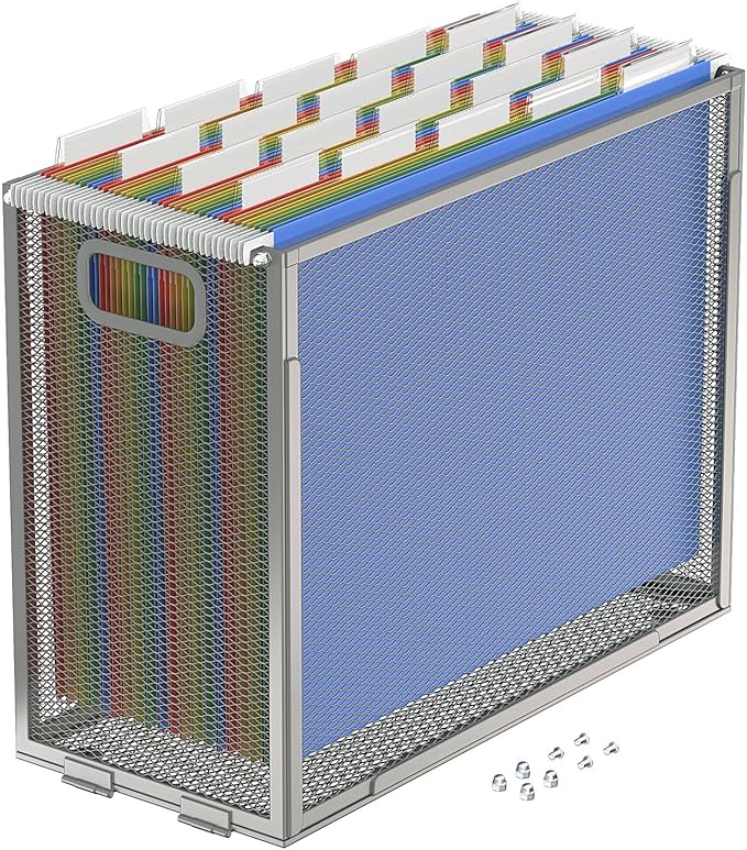 - [Special Design] This metal mesh hanging file organizer is detachable and fold-able, it can be easily assembled without tools. You can take it apart and fold it up when not in use.