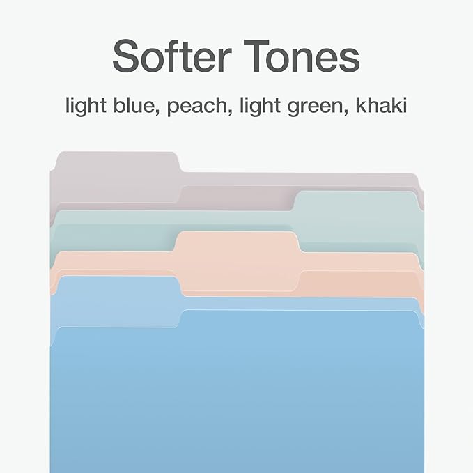 - Work faster and smarter; color file folders in calming pastels (khaki, peach, light blue and light green) let you spot the right file through color association