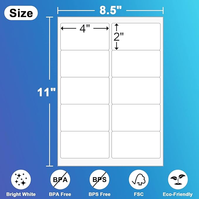 - Label size: 2" X 4", Sheet Size: 8.5" x 11". 10 labels per page. 4000 sheets, 40000 blank white sticker labels.